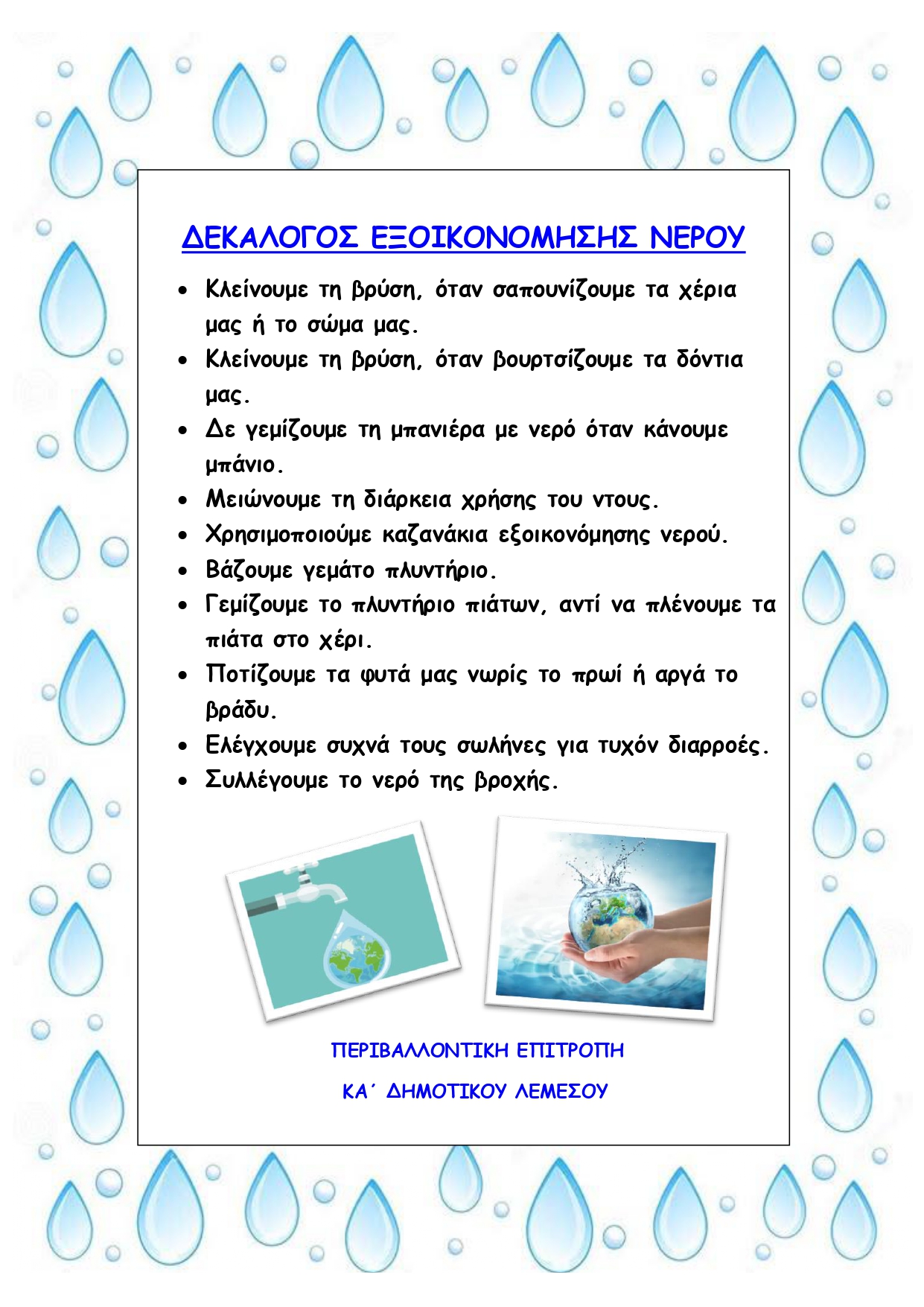 Τη φετινή σχολική χρονιά το σχολείο μας κατάρτισε περιβαλλοντική πολιτική με θέμα "Το νερό και η ανάγκη εξοικονόμησής του. Κλείνω τη βρύση, ανοίγω τον δρόμο για τη ζωή". Η περιβαλλοντική επιτροπή του σχολείου σύνταξε τον δεκάλογο εξοικονόμησης του νερού.